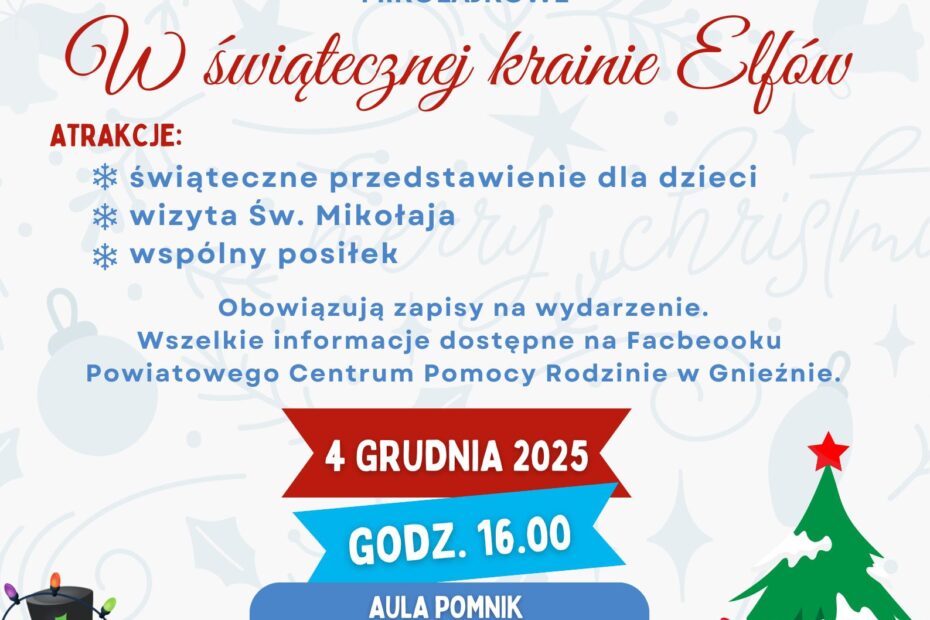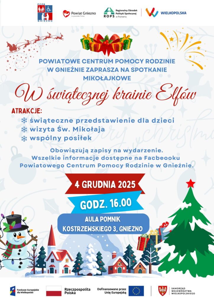 • Grudzień to wyjątkowy czas, w którym wszystkich ogarnia magia świąt. Powiatowe Centrum Pomocy Rodzinie w Gnieźnie również pamięta o swoich rodzinach zastępczych i z radością zaprasza na wyjątkowe spotkanie w świątecznej krainie Elfów!